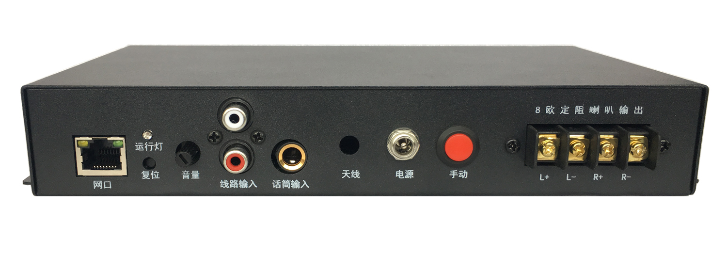 ◆內(nèi)置嵌入式網(wǎng)絡(luò)語音解碼模塊、2*100W/8Ω雙通道輸出功放,,驅(qū)動(dòng)外接音箱工作,設(shè)備運(yùn)行穩(wěn)定性高。